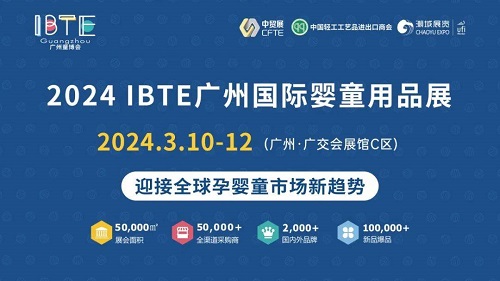 由中國對外貿易廣州展覽有限公司、中國輕工工藝品進出口商會、廣東潮域展覽有限公司聯合主辦的2024 IBTE廣州國際孕嬰童產品博覽會(簡稱“IBTE廣州童博會”)系列展之IBTE廣州國際嬰童用品展,將于2024年3月10-12日,在廣州廣交會展館C區舉辦!